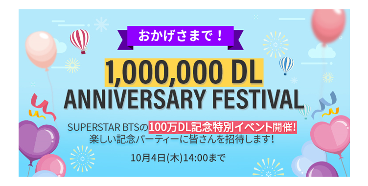 GAME 2018.09.28 ポノス株式会社(本社:京都府京都市、代表取締役:辻子依旦、以下「ポノス」)は、Big Hit Entertainment所属の人気アーティストグループBTS(防弾少年団)のリズムゲーム『SUPERSTAR BTS』(Android/iOS版)が累計100万ダウンロードを突破したことをお知らせ致します。また、2018年9月27日(木)より100万ダウンロードの突破を記念したイベントやリツイートキャンペーンを開始致しました。 ●100万ダウンロード記念! 「IDOL」ランキングイベント開催! 最新曲「IDOL」の楽曲スコアランキングに応じて合計3名様にBTSメンバー全員の「サイン入りCD」が当たるランキングイベントを開始しました。ランキング上位を目指して「IDOL」をプレイしてみよう! 【イベント期間】 2018年9月27日(木)~ 9月30日(日)23:00まで 【対象曲】 IDOL / LOVE YOURSELF 結 ‘Answer’ ※全難易度が対象です。 【条件 / 人数 / プレゼント内容】 楽曲スコア1位 / 【確定】1名様 / サイン入りCD「LOVE YOURSELF 結 ‘Answer’」 楽曲スコア2~100位 / 【抽選】2名様 /サイン入りCD「LOVE YOURSELF 結 ‘Answer’」 ※9月30日(日) 23:00 時点のスコアを基に、全難易度から上位100名を決定します。 ※複数の難易度に挑戦している場合、1番高いスコアで判定を行います。 ※その他詳細な注意事項に関しましては、アプリ内より特設ページをご確認ください。 ●100万ダウンロード記念! 「FESTIVAL」イベント開催! 100万ダウンロード突破を記念して、期間中様々な恩恵が得られる「FESTIVAL」イベントを開始いたしました。当イベントでは1日に最大100個のダイヤやRカードが貰えるスペシャルログインボーナス、レアカードの排出確率がアップした特別なパックの登場、楽曲クリア経験値の増加、楽曲クリア報酬のカード枚数アップなど、遊べば遊ぶほどお得な内容が盛りだくさんのイベントです。 【FESTIVALイベント内容】 ①スペシャルログインボーナス ②楽曲経験値 x2倍 ③ヘッドフォン消費数「1」 ④ヘッドフォン回復時間短縮 ⑤楽曲クリア時のカード枚数アップ ⑥カード強化時の必要リズムポイント半減 ⑦最大30%!ダイヤ増量 ⑧1日1回購入可能「DAILY PREMIUM CARD PACK」 ⑨100万DL記念商品販売 ※詳細はゲーム内の特設ページをご確認下さい。 【イベント期間】 2018年9月27日(木)~ 10月4日(木)14:00まで ※スペシャルログインボーナスのみ10月3日(水)23:59までです。 ※イベント期間及び内容は余儀なく変更される場合がございます。 ●レアカード排出確率 x3UP「FESTIVAL CARD PACK 10」登場! FESTIVALの開催を記念して、48時間限定で「R」と「S」グレードのカード排出確率がアップした特別なカードパックが登場します。 【販売期間】 2018年9月30日(日)0:00 ~ 10月1日(月)23:59まで ※詳細はアプリ内「提供割合」をご確認ください。 ●100万ダウンロード記念!フォロー&リツイートキャンペーン 対象投稿のリツイート数に応じて報酬が増加するリツイートキャンペーンを開始いたしました。更に、フォロー&リツイートを行っていただいた方の中から抽選で10名様に「プリズム確定Rカード」もプレゼントします。 【Twitter キャンペーン期間】 2018年9月27日(木)~ 10月4日(木)14:00まで 【条件 / 報酬】 1000RT達成 / ダイヤ10個 2000RT達成 / ダイヤ20個 追加 3000RT達成 / ダイヤ30個 追加 【抽選報酬】 10名様 / プリズム確定Rカード 1枚 【Twitterアカウント】 ・SUPERSTAR BTS 公式 (@SSB_JP_Official) https://twitter.com/SSB_JP_Official 【Twitterキャンペーン注意事項】 ・次の場合は抽選対象外とさせていただきますのでご注意ください。 -Twitterアカウント「SUPERSTAR BTS 公式(@SSB_JP_Official)」をフォローしていない場合。 -リツイートが削除されていた場合。 -DMでの連絡が行えない場合。 ●『SUPERSTAR BTS』概要 タイトル 『SUPERSTAR BTS』 ジャンル リズムゲーム 対応OS iOS/Android 配信日 2018年5月22日(火) 価格 基本無料(アプリ内課金あり) 公式サイト https://www.superstarbts.jp/ 公式YouTubeチャンネル https://youtube.com/channel/UCXsoYGY-dZ6h-e-z1QGbICw/ App Store https://itunes.apple.com/jp/app/id1353294340 Google Play https://play.google.com/store/apps/details?id=jp.co.ponos.superstarbts 著作権表記 © Big Hit Entertainment / DALCOM SOFT / PONOS Corp. All rights reserved. ・補足情報『SUPERSTAR BTS』とは 『SUPERSTAR BTS』は、2018年1月に韓国でApp Store及びGoogle Playで配信が開始され、累計1000万ダウンロードを記録した世界中で人気のアーティストBTS(防弾少年団)の楽曲にあわせてプレイできるリズムゲームです。日本版では、日本オリジナル楽曲も随時アップデートされる予定。また本ゲームでしか見る事ができないBTSメンバーのオリジナルカードが入手できるなど、BTSファン必見の内容です。 ※画像は実際の内容と異なる場合があります。 BTSのアルバムからプレイしたい楽曲を選んでプレイしよう!楽曲プレイではノーツをタップしてスコアを獲得できます。高い難易度に挑戦したり、カードの強化を行うことで、より良いスコアを獲得できるようになります。獲得したスコアは様々なランキングに反映されるため、ファン同士で高スコアを目指して競い合いながらプレイできます