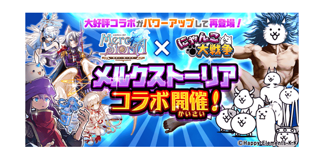 GAME 2018.11.01 ポノス株式会社(京都府京都市)は、同社のスマートフォン向けゲームアプリ「にゃんこ大戦争」にて、Happy Elements株式会社(京都市下京区)のスマートフォン向けゲームアプリ「メルクストーリア」とのコラボレーションイベントを、2018年11月1日(木)より開始いたしましたので、これをお知らせいたします。 【コラボ概要】 ■コラボ1 コラボ限定レアガチャ「メルクストーリアガチャ」が復刻登場! さらに一部の限定キャラクターに第3形態追加! ■コラボ2 コラボ限定ステージ復刻開催!さらに2つのステージがリニューアルして再登場! 新たな遊び方で楽しめるにゃ! ■コラボ3 ネコ道場「ランキングの間」にて、新イベント「無気力修行」開催! ■コラボ4 イベント期間中、「メルクストーリア」をプレイして特典をゲット! ■コラボ5 両タイトル公式SNSにてプレゼントキャンペーンを実施! イベント開催期間(予定) 2018年11月1日(木)11:00 ~ 11月15日(木)10:59 ■コラボ1 コラボ限定キャラクターが出現する「メルクストーリアガチャ」が登場! 以前のコラボで登場したキャラクターが出現するにゃ! コラボガチャ限定キャラクターの能力を紹介! 【超激レア】 とどめき たまにエイリアンとゾンビの動きを遅くする!(範囲攻撃) 【超激レア】 ミシェリア 浮いてる敵にめっぽう強く、たまに動きを止める!(範囲攻撃) 【超激レア】 ハルシュト たまにクリティカルを放ち、メタルに打たれ強い! 【超激レア】 コーネリア 黒い敵と赤い敵の動きをたまに一瞬止める!(範囲攻撃) 【超激レア】 ユーヴェンス 天使に打たれ強い! 【超激レア】 ミスティカ 射程が長く黒い敵にめっぽう強い!(範囲攻撃) 【超激レア】 ワイバーン 黒い敵に超ダメージを与える!(範囲攻撃) 【激レア】 オルトス、シトルイユ、アロイス、レイ、アウラ 【レア】 セレス、ノノ、オルガ、ノルン、よいち、セラム、フウ さらに、超激レアキャラ「ハルシュト」「ミシェリア」、激レアキャラ「オルトス」が新たに第3形態に進化可能に! コラボ限定キャラクターをぜひゲットするにゃ! ■コラボ2 「メルクストーリア」のキャラクターが登場するコラボ限定ステージ開催! 以前のコラボで開催したステージが復刻!さらに2つのステージがリニューアルして再登場にゃ! ・コラボステージ「対決!メルクストーリア」 ・コラボステージ「地獄のメルクストーリア」 ステージクリアで、限定EXキャラクター「癒術士」が手に入るチャンスにゃ! ・コラボステージ「逆襲のメルクストーリア」NEW 経験値を大量に獲得できるステージとして再登場! ・コラボステージ「神秘のメルクストーリア」NEW 出撃制限ステージに改修!以前とは違った遊び方ができるステージとして再登場! ・コラボステージ「開眼の癒術士襲来!」 ・コラボステージ「開眼のメルク襲来!」 ・コラボステージ「開眼のティティ襲来!」 超難関ステージ! ステージクリアで、「癒術士」「メルク」「ティティ」をそれぞれ第3形態に進化させるチャンスにゃ! さらに、ステージクリア報酬として「メルクストーリア」で使える特典をゲット可能! ・【逆襲のメルクストーリア】ステージ1クリア 「50万ゴルド」+「ダイヤ3個」 ・【神秘のメルクストーリア】ステージ1クリア 「100万ゴルド」+「ダイヤ3個」 ・【神秘のメルクストーリア】ステージ2クリア コラボ限定ユニット「ネコヴァル(☆3)」「もねこ(☆2)」「ねねこ(☆3)」「アフロディテ(☆4)」 +シードモンスター(サイズ:1.000)「ネコ(☆1)(NEW)」「勇者ネコ(☆2)(NEW)」 +「ダイヤ3個」 それぞれ「メルクストーリア」アプリ内でゲット出来るにゃ! また、「にゃんこ大戦争」をダウンロードしているユーザーに以下のシードモンスター・アイテムをプレゼント! 【シードモンスター】 ※全てサイズ:1.750 ネコ(☆1)、勇者ネコ(☆2)、キモネコ(☆2)、ネコドラゴン(☆3)、巨神ネコ(☆4)、ネコムート(☆3)、ぶんぶん先生(☆4) 【アイテム】 ダイヤ3個 ■コラボ3 ネコ道場「ランキングの間」にて新イベント「無気力修行」開催! コラボ限定のランキングイベントを実施するにゃ! 「メルクストーリア」キャラクターが登場する腕試しイベント! ステージクリア時に記録されるスコアによって全国での暫定順位が決定! イベント期間終了後には最終的な順位が確定し、順位に応じた様々な報酬をゲットできるにゃ! 報酬内容はネコ道場内の右上にある「報酬リスト」ボタンから確認可能! 迫り来る癒術士とその仲間たちに挑戦して、ランキング上位を目指すにゃ! ■コラボ4 イベント期間内に「メルクストーリア」アプリのストーリークエスト、コラボステージをクリアして「にゃんこ大戦争」内で使える特典をゲット! ・「メルクストーリア」インストールで限定EXキャラクター「メルク」 ・コラボクエスト「侵猫の濤島」九州クリアで限定EXキャラクター「ティティ」 + レアチケット1枚 ・コラボクエスト「侵猫の濤島」四国クリアでにゃんこチケット3枚 ・コラボクエスト「侵猫の濤島」本州クリアでレアチケ