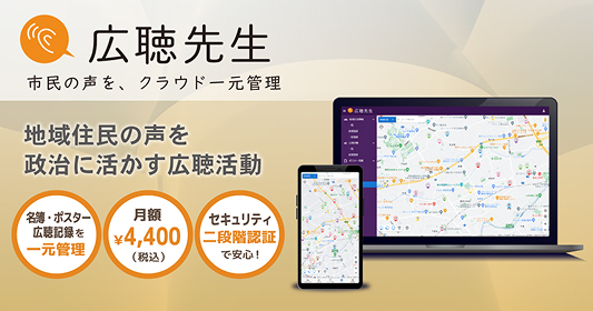 政務活動を効率化! 長く愛される政治家を支える政務活動管理サービス。クラウド名簿で自動で地図落とし。全てのデータを二段階認証のクラウド管理。初期費用無料ではじめられます!
